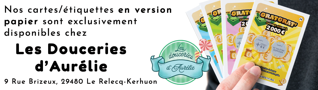 Nos cartes à gratter et étiquettes pour bouteilles en version papier sont uniquement disponibles en magasin, chez Les Douceries d’Aurélie près de Brest (annonce grossesse, gender reveal, parrain, marraine, témoin mariage). Dans la limite des stocks disponibles.