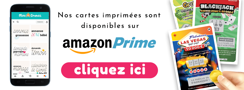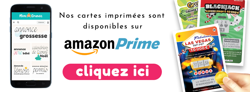 Mimi grandit, le site n°1 en France pour les annonces de grossesse originales et digitales, vous propose une large gamme de cartes virtuelles à gratter en ligne sur téléphone ou par SMS ainsi que des fichiers PDF à télécharger et à imprimer chez soi. Annonces de grossesse, demandes en parrain/marraine, mariage, PACS, première dent, lettre au Père Noël… chaque création est imaginée avec soin pour faire sourire et émouvoir vos proches. Certaines cartes sont personnalisables, d’autres prêtes à être utilisées en un clic; toutes sont faites avec amour depuis la pointe bretonne. Produits à but ludique uniquement : ceux-ci sont des articles de papeterie factices / numériques, sans valeur monétaire. Ils ne permettent pas de gagner de l’argent, des biens ou des lots réels.
