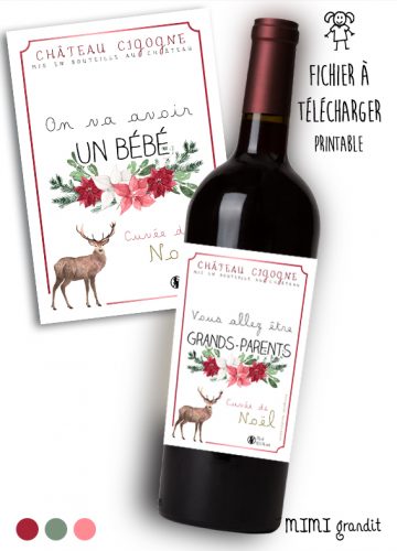 Voici une idée originale pour faire votre annonce de grossesse à Noël: fichier à télécharger, à imprimer de chez vous (de préférence sur du papier adhésif {exemple ici}) et à coller sur une bouteille (vin, Bordeaux).