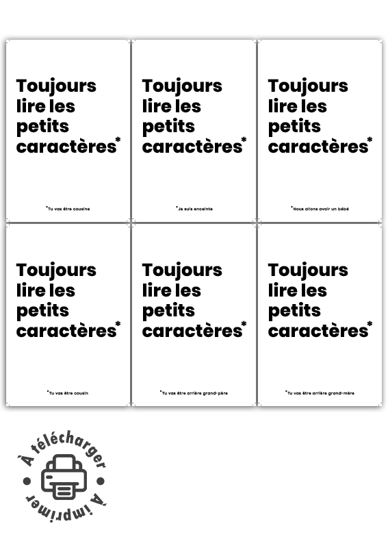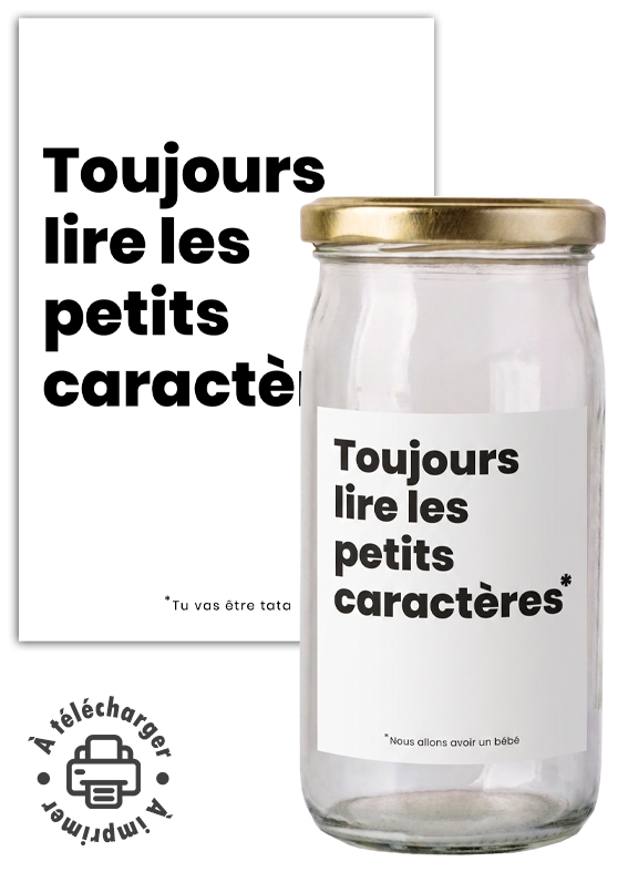 Le secret d’une annonce réussie réside souvent dans la surprise. Avec ce visuel minimaliste et intrigant, vous invitez vos proches à s’approcher de très près pour découvrir la grande nouvelle. L’accroche « Toujours lire les petits caractères »* attire l’œil, tandis que l’astérisque révèle le message tant attendu en bas de l’étiquette. C’est une façon ludique et moderne de personnaliser votre annonce à moindre coût.