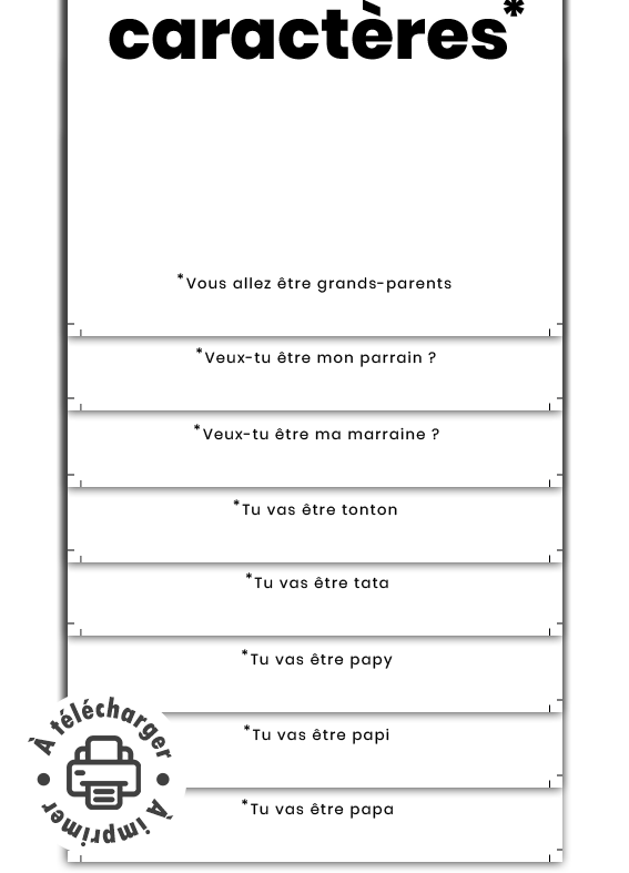- 21 modèles disponibles; au choix : Veux-tu être mon parrain / ma marraine ? / Vous allez être grands-parents / La famille va s’agrandir / Nous allons avoir un bébé / Je suis enceinte / Tu vas être papa, papi, papy, mamie, mamy, tata, tonton, grand-père, grand-mère, arrière grand-père, arrière grand-mère, cousin, cousin, grand frère, grande sœur.