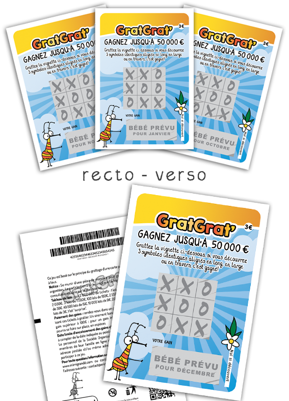 L’annonce d’une grossesse est un moment fort, mais révéler la date prévue de l’accouchement ajoute une touche d’excitation supplémentaire. C’est pourquoi nous avons créé ce ticket de jeu plus vrai que nature. Grâce à cette carte à gratter mois de naissance, vos proches participent activement à la nouvelle en grattant les cases pour découvrir le message caché. De plus, l’illusion est totale avec un règlement factice au verso et une encre en latex « lisse » identique aux tickets de la FDJ.