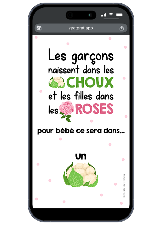 Voici une idée d’annonce sexe bébé originale et rigolote. La carte à gratter numérique Chou ou Rose. Ne perdez pas une seule minute pour annoncer le sexe du futur bébé !