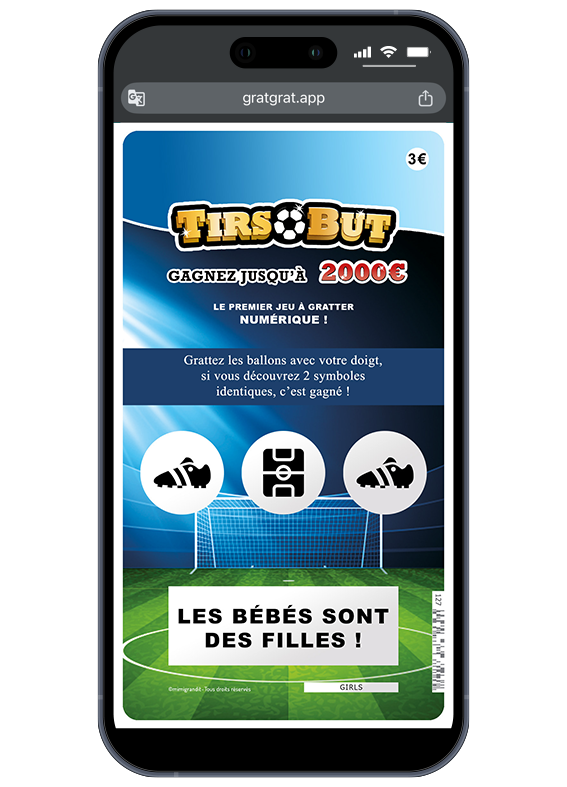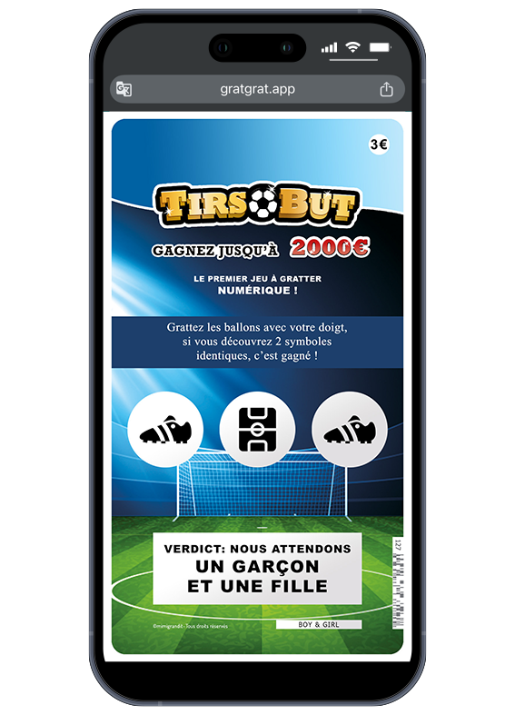 Vous cherchez une façon dynamique et originale d’annoncer l’arrivée de vos futurs joueurs ? Cette annonce sexe jumeaux / bébé solo numérique mise sur l’interactivité d’un jeu de grattage style « Tir au but » pour créer un moment inoubliable. Vos proches se prêtent au jeu : « Grattez les ballons avec votre doigt, si vous découvrez 2 symboles identiques, c’est gagné ! ». Une fois les ballons grattés, c’est dans la case finale que l’émotion explose avec l’annonce du sexe de votre ou de vos futurs bébés.