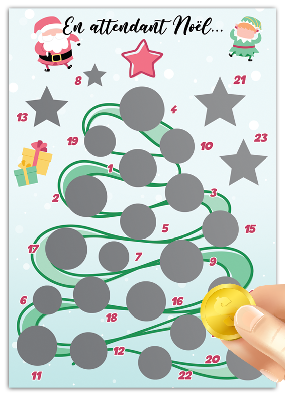 Noël approche à grands pas… pour faire patienter votre enfant, voici un joli calendrier. Le principe est simple: chaque jour, accompagné de vous et/ou de son papa, votre enfant grattera une case. En grattant, il pourra découvrir des activités, des moments à partager avec vous et d’autres surprises. Ces découvertes pourront être partagées en famille si frères et sœurs, elles s’appliquent à tous (un par famille).