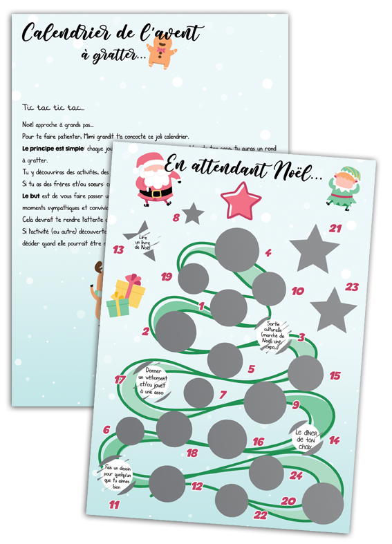 Calendrier de l’avent à gratter pour enfants de 3 à 7 ans environ. En grattant, votre enfant pourra découvrir des activités, des moments à partager avec ses parents et d’autres surprises. Ces découvertes pourront être partagées en famille si frères et sœurs.