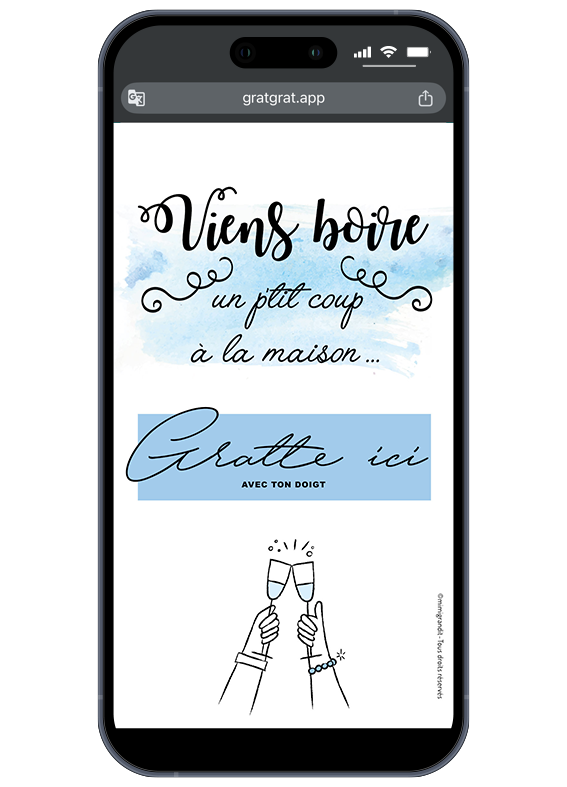 L’invitation qui donne soif de convivialité ! Surprenez vos amis avec cette carte à gratter virtuelle invitation au message drôle et décalé. Que ce soit pour une crémaillère, un barbecue ou une simple soirée, ce concept interactif et écologique remplace avantageusement le papier. Vos invités découvrent votre texte personnalisé en faisant glisser leur doigt sur l’écran de leur téléphone (ou en utilisant leur souris sur ordinateur).
