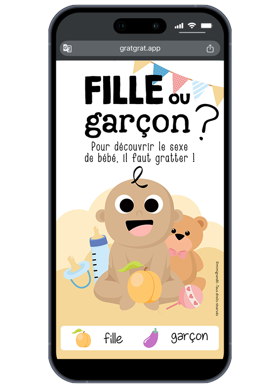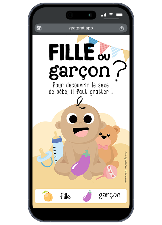 Faites l’annonce du sexe de bébé avec cette carte à gratter en ligne, numérique. Jeu à gratter avec le doigt ou la souris, à envoyer par SMS, mail. Une annonce fille ou garçon remplie d’humour.