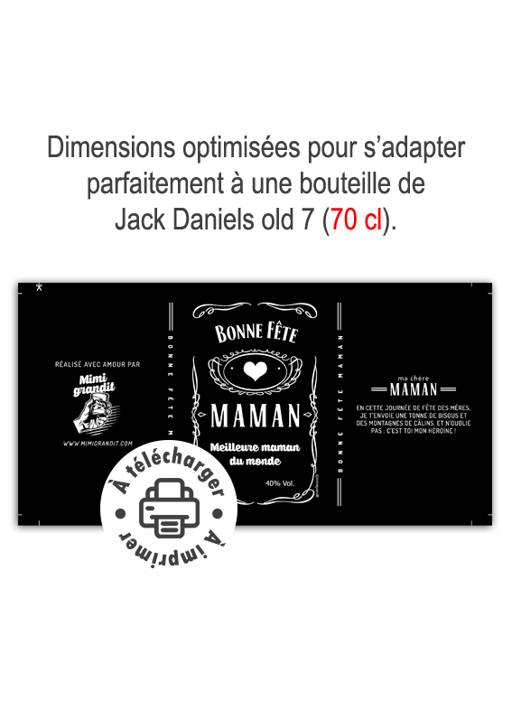 - Prêt à l’emploi : Fichier PDF Haute Définition. Dimensions optimisées pour s’adapter parfaitement à une bouteille de Jack Daniel’s Old No. 7 (70 cl). Taille : 20,5 x 10,5 cm + fond perdu (traits de coupe sur fichier).