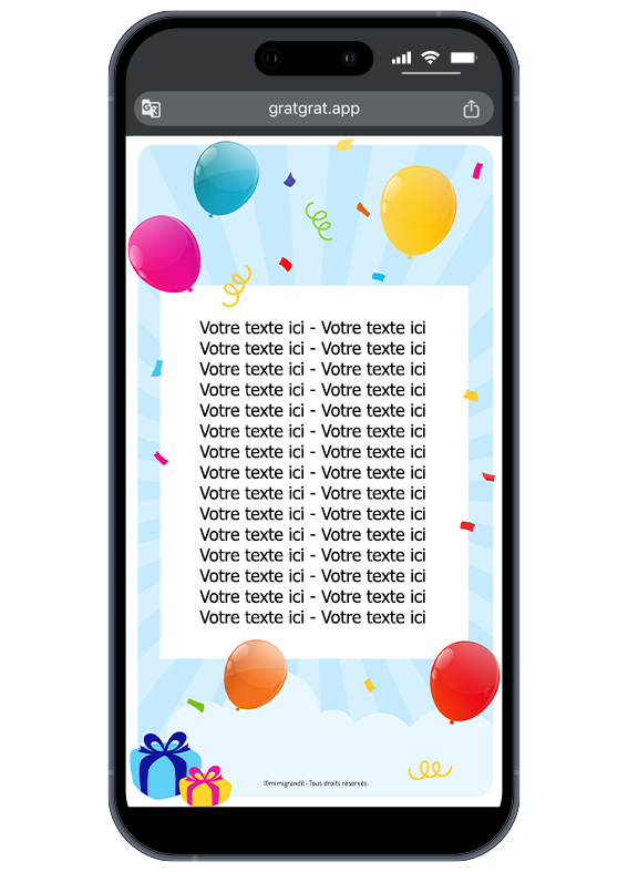 Célébrez l’événement avec une explosion de couleurs et de surprise ! Cette invitation anniversaire enfant sur téléphone (qui convient aussi parfaitement aux plus grands) mise sur un design universel de ballons et de cadeaux. C’est le support idéal pour annoncer une fête de manière moderne, écologique et surtout amusante. Vos invités n’ont qu’à gratter l’encre virtuelle avec leur doigt sur leur écran de smartphone (ou à la souris sur ordinateur) pour découvrir votre message.