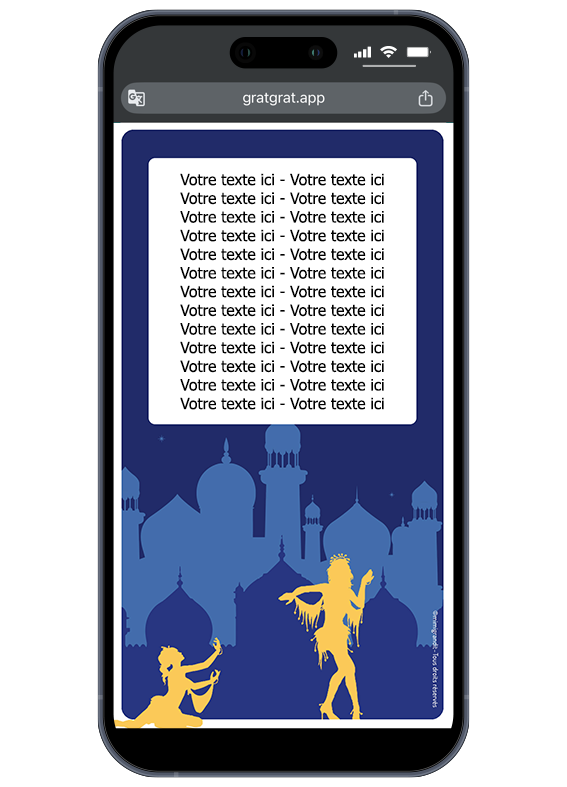 Embarquez vos invités pour une épopée digne des contes de Shéhérazade ! Cette invitation numérique 1001 nuits est l’écrin parfait pour vos événements les plus prestigieux : anniversaire, mariage ou fête à thème. Avec son design élégant mettant en scène des danseuses devant un palais majestueux, elle allie mystère et célébration. Vos invités découvrent votre message personnalisé en grattant l’écran de leur smartphone avec le doigt, ou avec la souris sur un ordinateur.