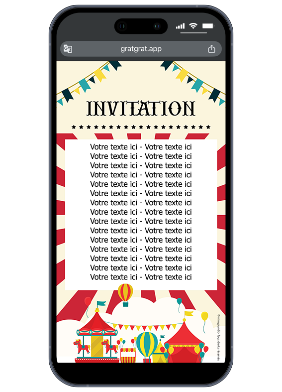 Approchez, approchez ! Découvrez l’invitation la plus spectaculaire pour votre fête ! Cette invitation virtuelle enfant cirque transporte vos proches sous le grand chapiteau en un clic. En effet, ce concept moderne remplace le papier par une expérience de grattage unique. De plus, vos invités découvrent le texte caché en grattant l’écran de leur smartphone avec le doigt. Cependant, pensez bien à vérifier vos dossiers spams et promotions pour recevoir vos mails.