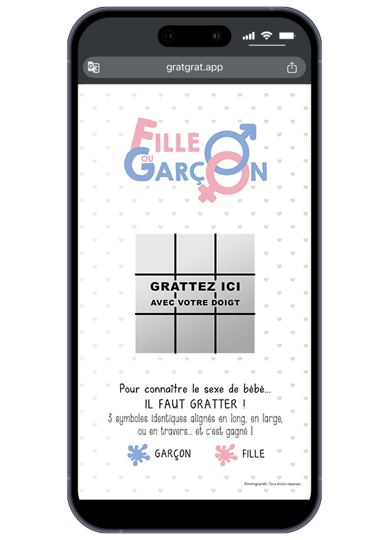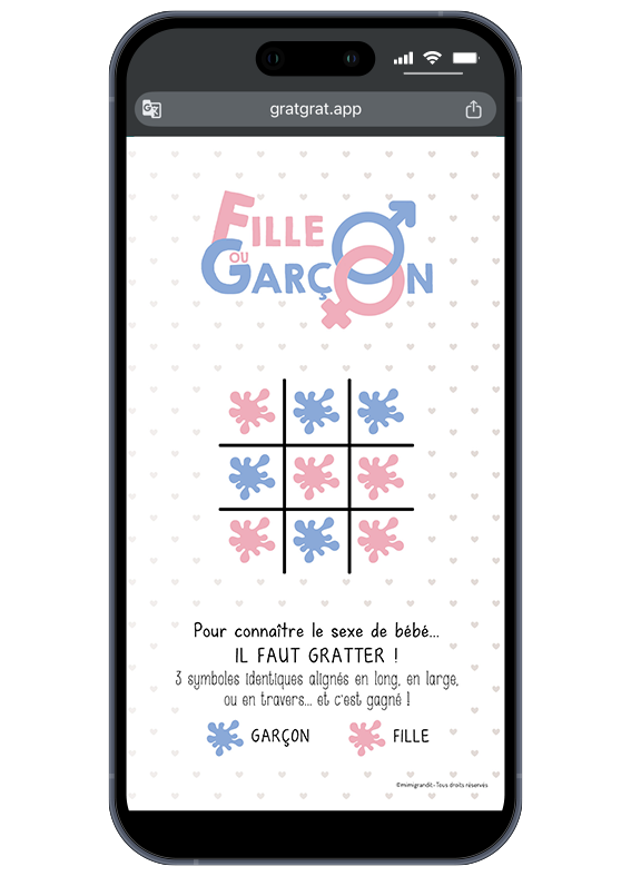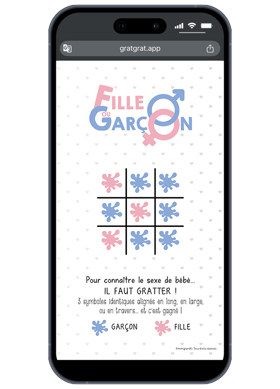 Alignez trois symboles et décrochez le gros lot : la plus belle des nouvelles ! Cette annonce sexe bébé morpion transforme la révélation de genre en un véritable petit défi ludique pour vos proches. Vos destinataires reçoivent un lien interactif et doivent gratter la grille de Tic-Tac-Toe directement sur leur écran. Dès que trois taches de couleur sont alignées, le secret est dévoilé ! C’est une solution moderne, écologique et immédiate pour informer tout votre entourage, peu importe la distance.