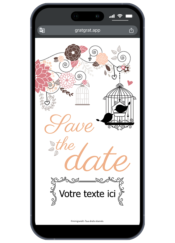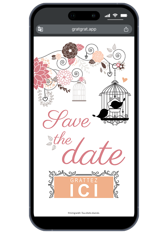 Annoncez votre bonheur avec une délicatesse infinie ! Ce save the date carte a gratter numérique romantique est idéal pour informer vos proches de votre mariage à venir. Son illustration mêlant une cage à oiseaux vintage et des fleurs dans les tons rose et beige apporte une touche de charme irrésistible. Ce modèle prévoit une zone de texte spécifique pour y noter la date de votre union. Vos invités découvrent la surprise en grattant l’écran de leur smartphone avec le doigt, ou avec la souris sur un ordinateur.